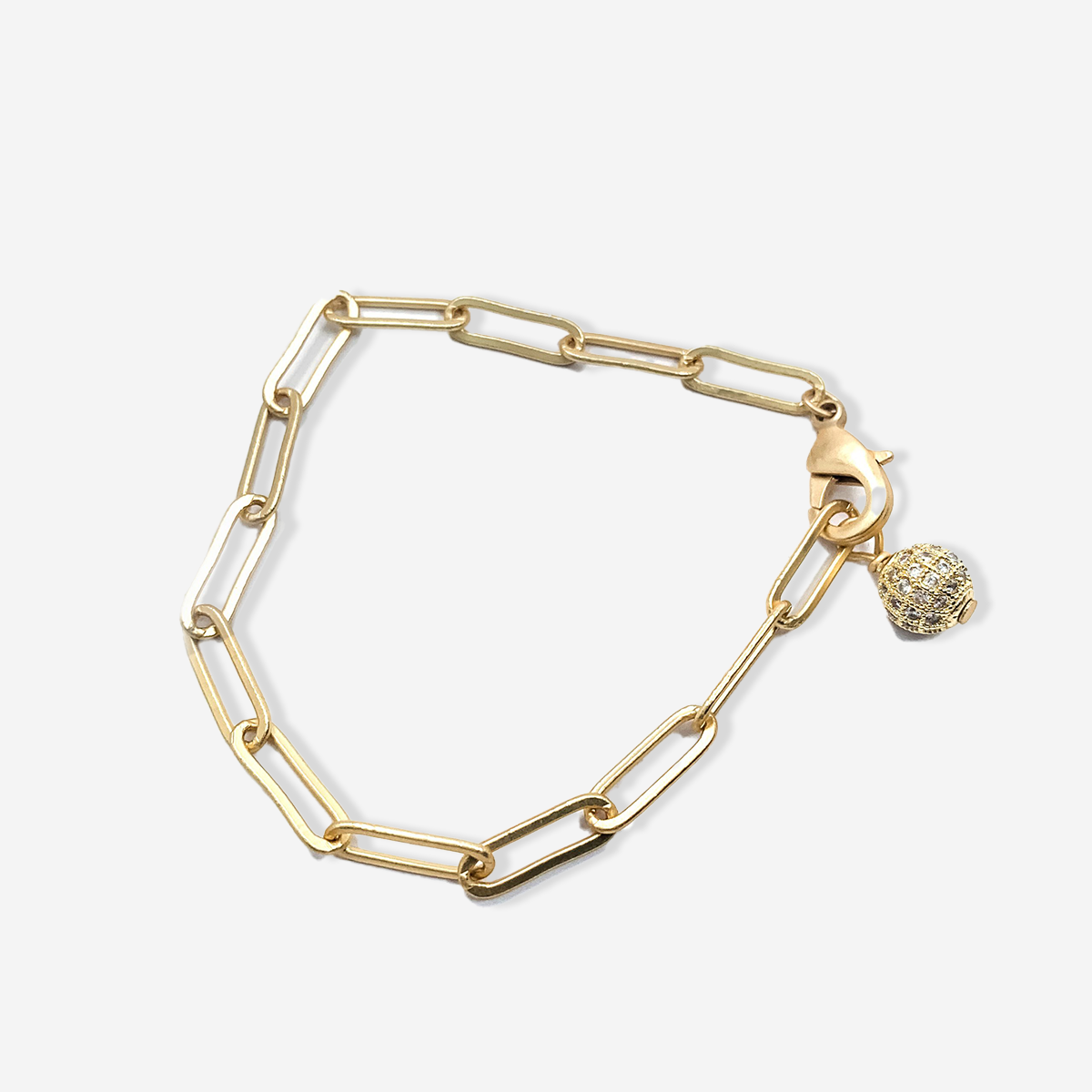 Bracelet of matte gold paperclip chain with hold pave dangle ball