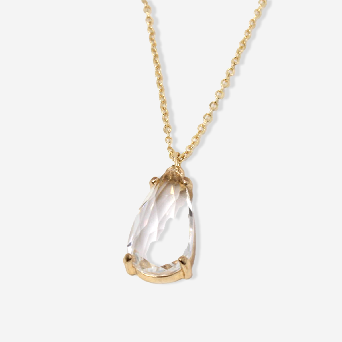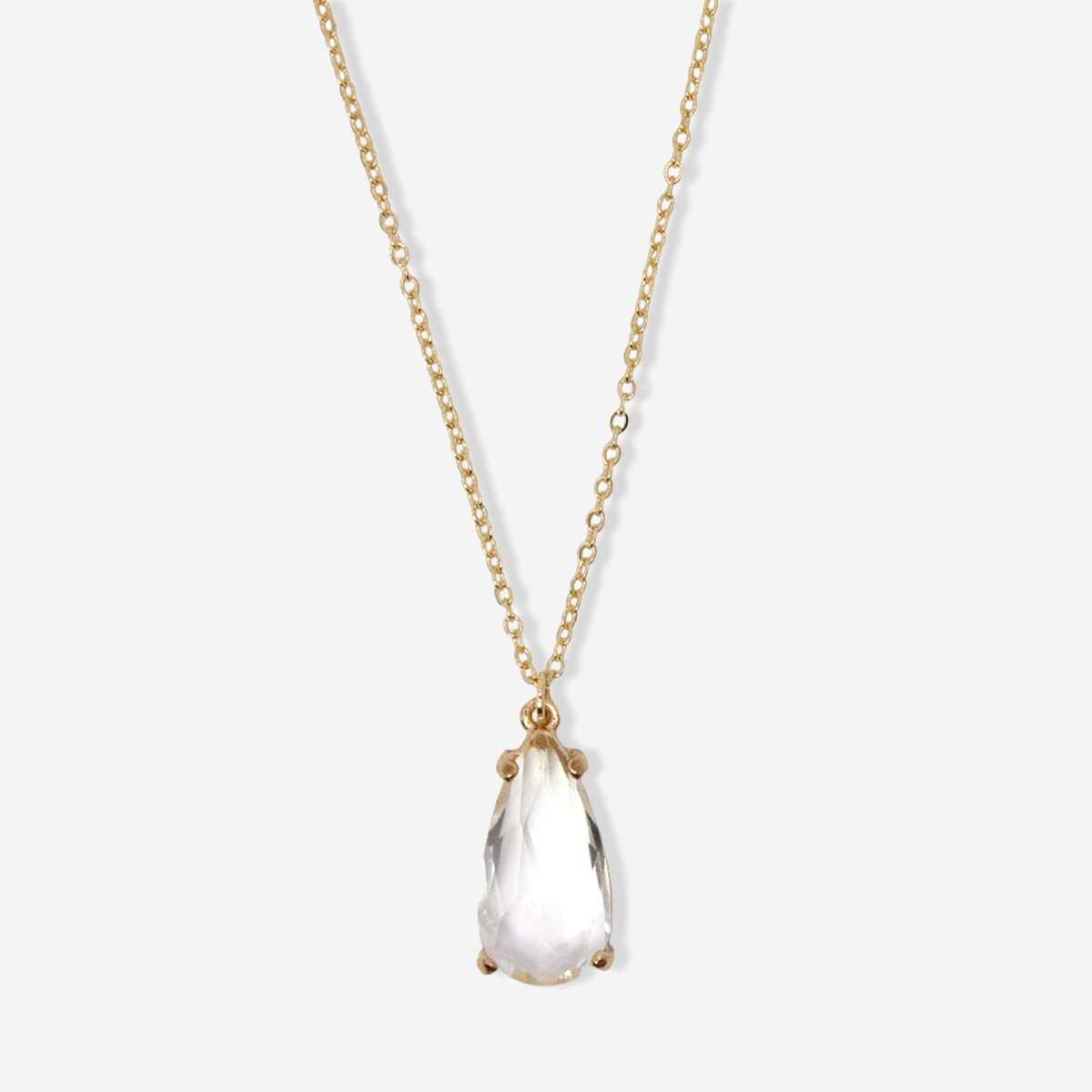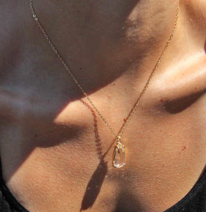 Short necklace with thin gold chain and a stunning pear shaped clear crystal pendant.