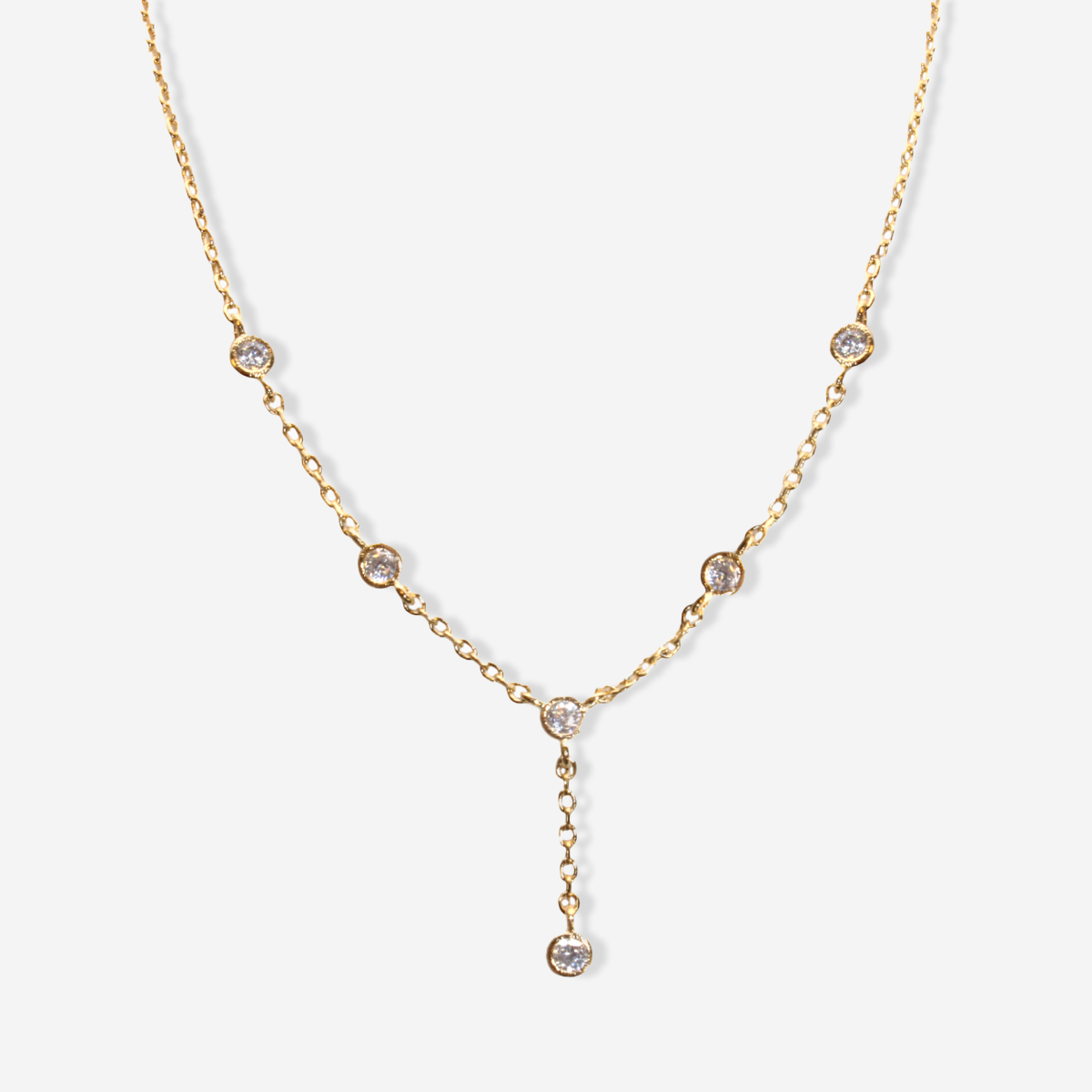 Delicately crafted, this necklace features a slender lariat-style chain adorned with dainty, small round rhinestones that twinkle like stars.