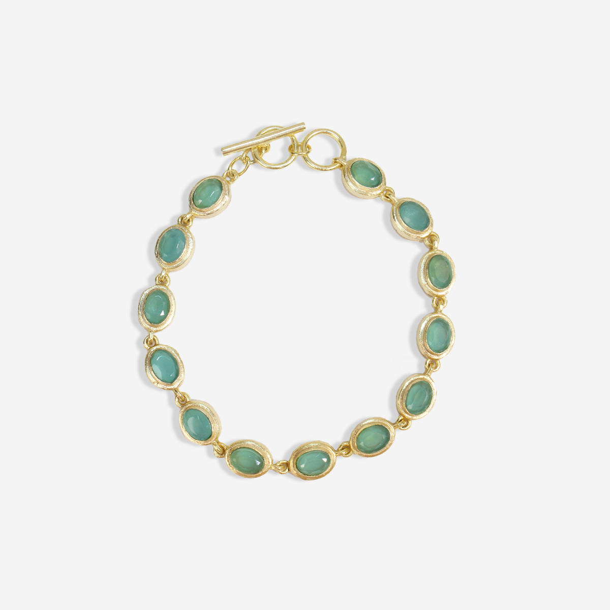 This bracelet is a must-have. Get wrapped up in style with this piece, featuring a stunning peru chalcedony stone, this playful piece adds a touch of elegance to any outfit with its matte gold plating.