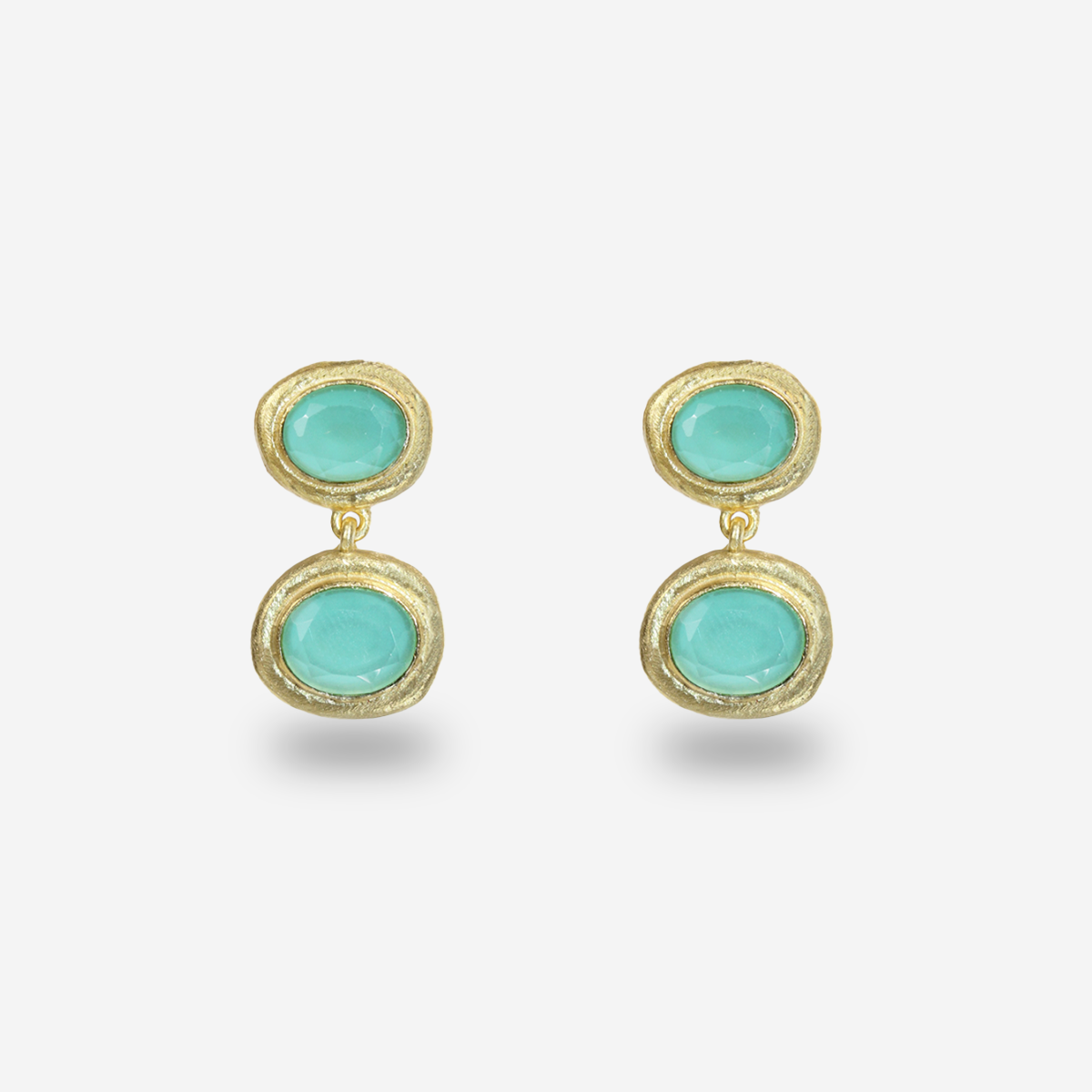 These playful dangle earrings feature two oval shaped Peru chalcedony color stones that will catch everyone's eye. Perfect for adding a pop of color and fun to any outfit.