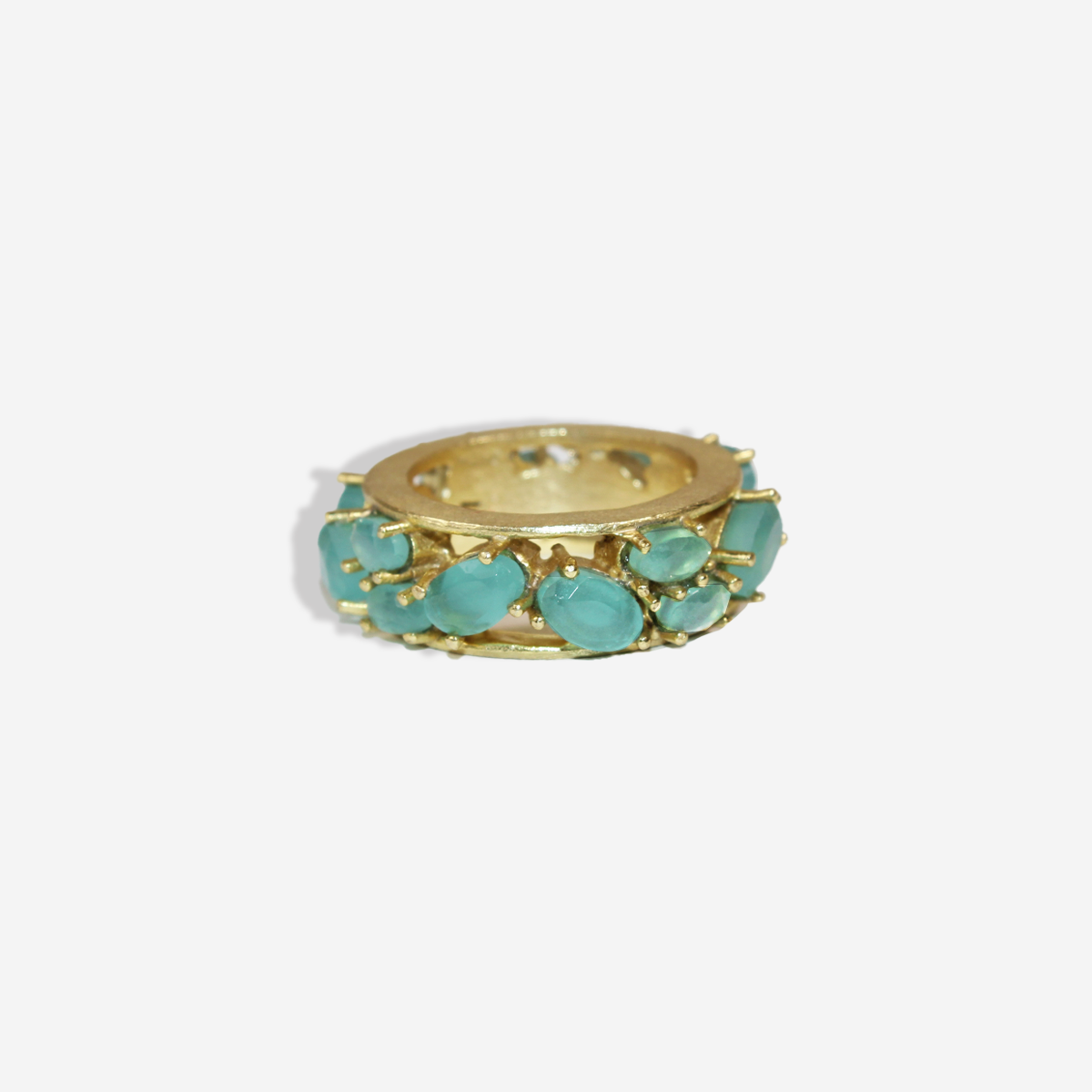 Featuring an array of irregularly shaped Peru chalcedony stone this unique band offers a touch of elegance to any outfit. Make a statement and add a pop of color to your look with this eye-catching piece.