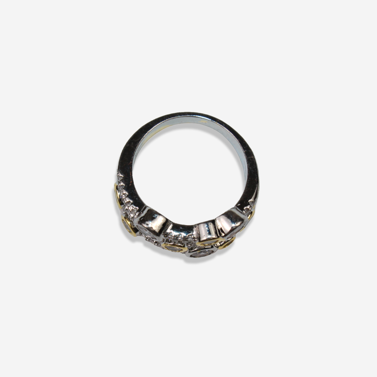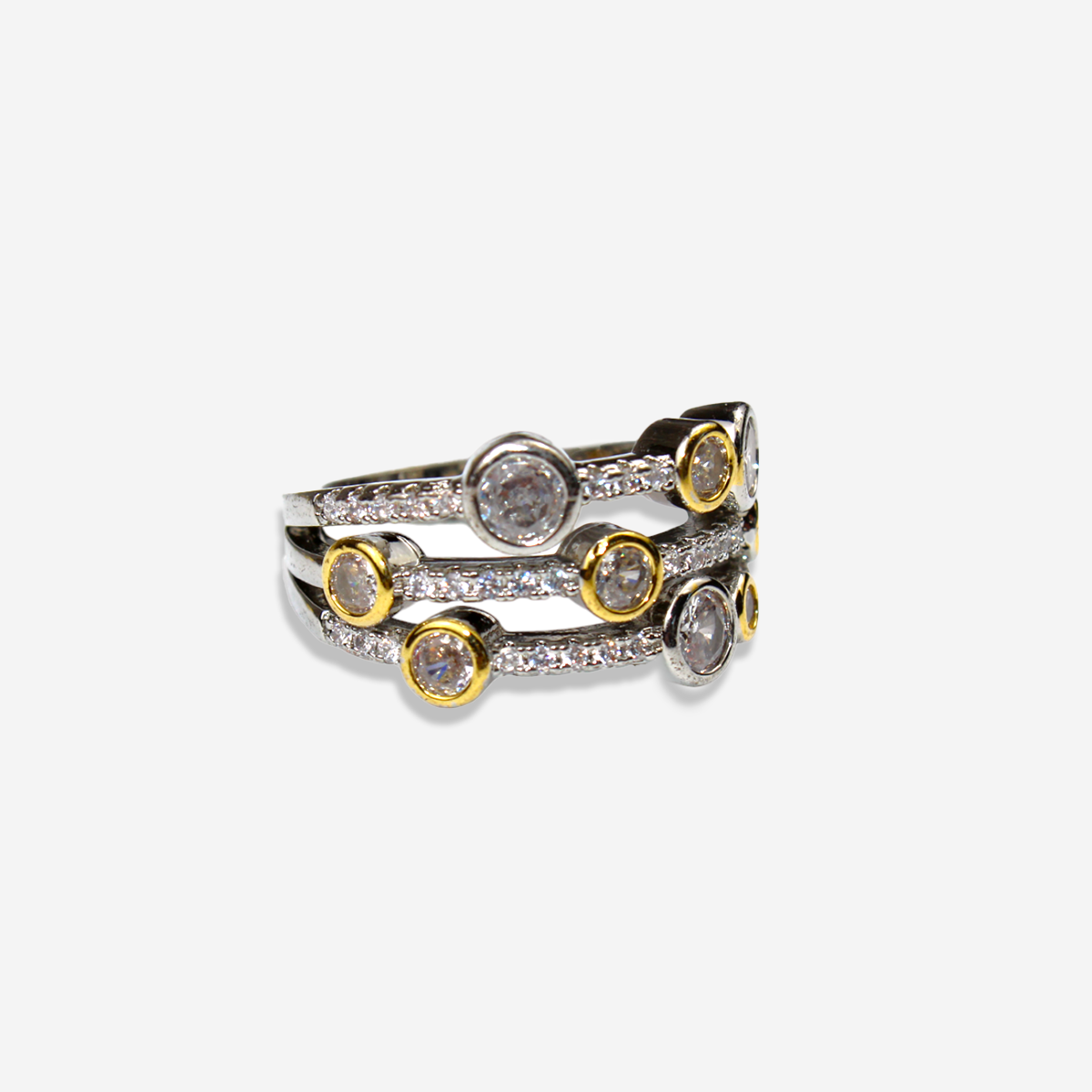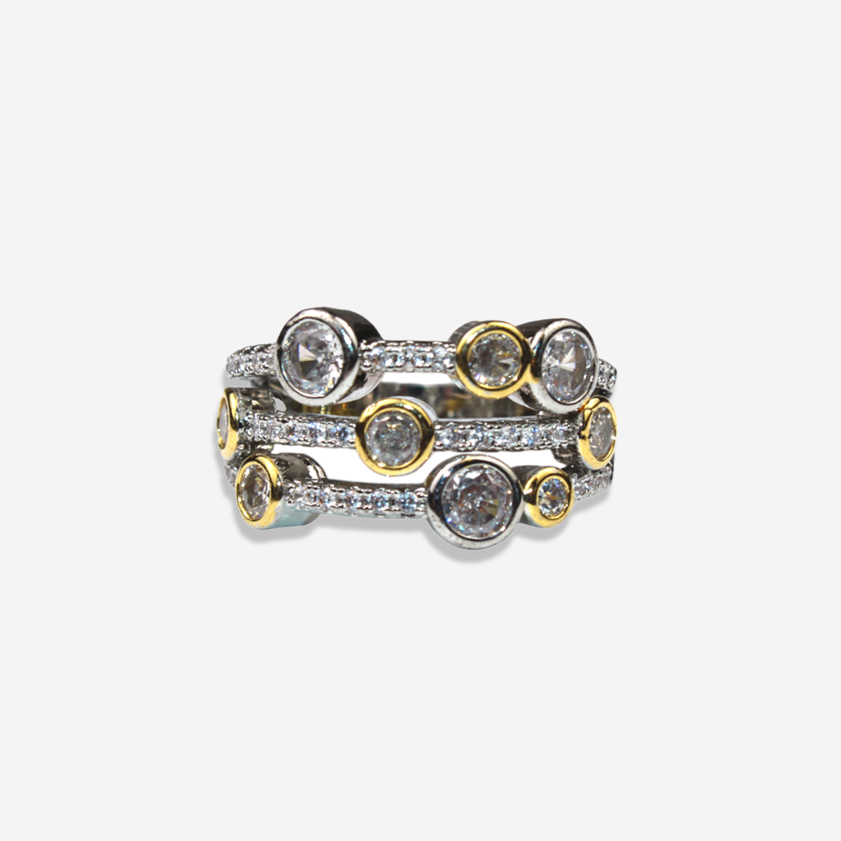 Rock a unique look with this 3 row ring combined with mixed metal and paves for an eye-catching design. Stand out from the crowd and add some flair to your style!